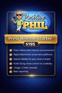More than a traditional podcast, Positive Phil is designed as a visibility platform—one that helps transform conversations into lasting digital assets through interviews, publishing, and press release-style distribution.