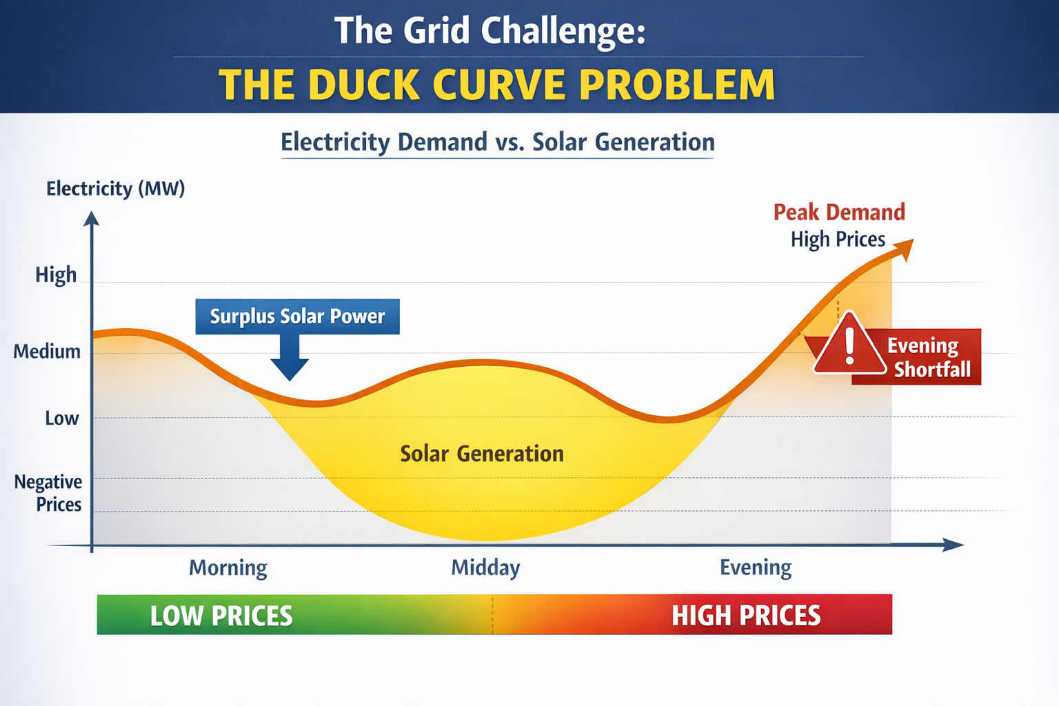 At midday, solar floods the grid with cheap electricity. Prices collapse. Sometimes they even go negative.